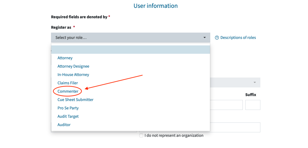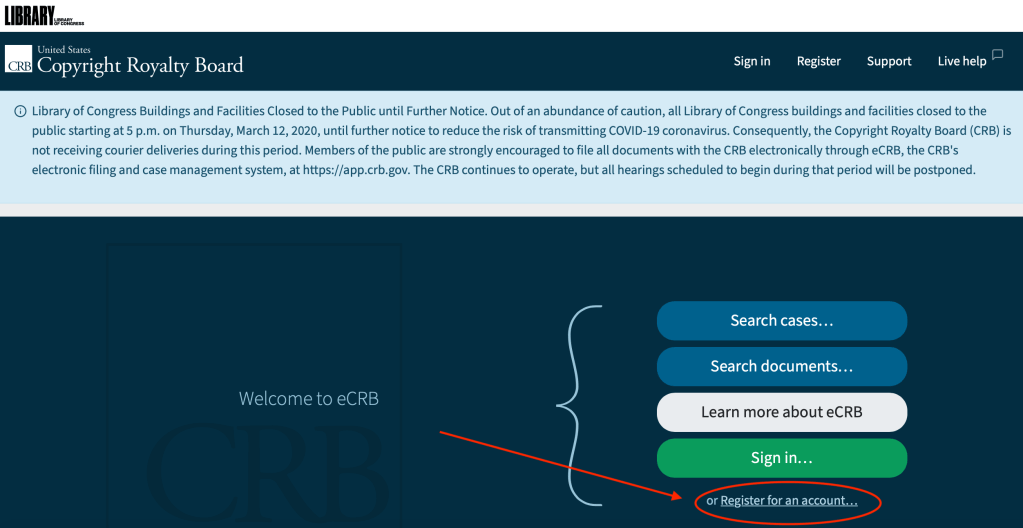 Filing comments with the CRB is not quite as simple as filing comments with the Copyright Office and it takes a bit of time–comments close on July 26, so do not leave setting up your account until July 26, or even July 25. I would do it today. You can set up your account before you file your comments so that the account part is all ready to go.