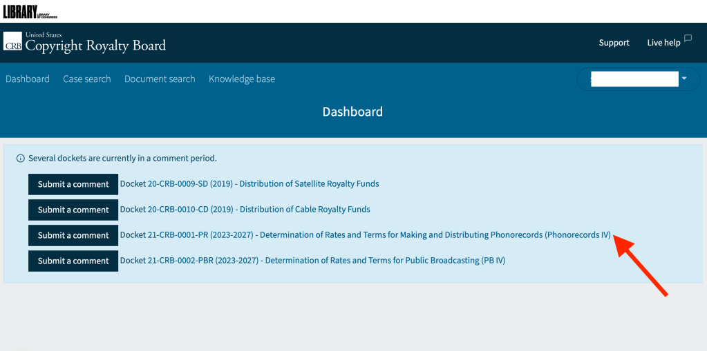 The comment you want to file is for Phonorecords IV. You can ignore the other dockets. It took me several trips to the support desk to get the correct filing tabs on my account, hopefully you won’t have that problem. But–just in case, don’t be running around crazy on July 26 trying to file the comment you slaved over because you left the account to the last minute.
