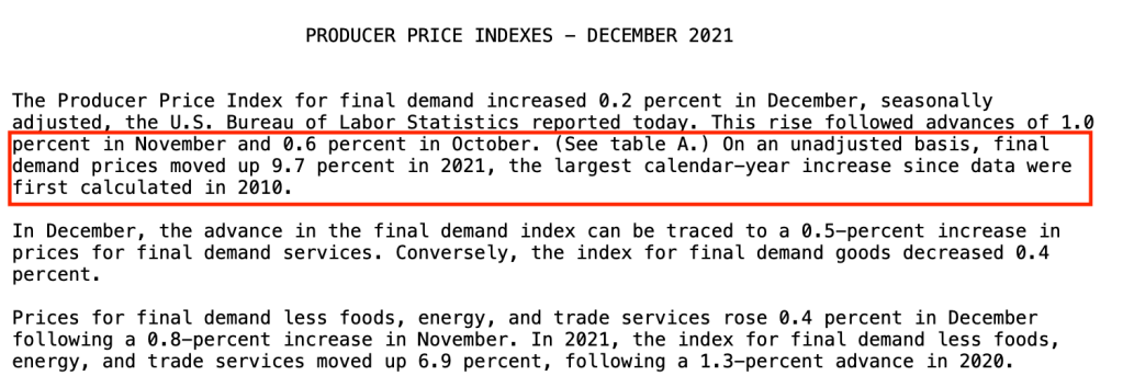 The Producer Price Index for 2021 was measured at 9.7% by the Bureau of Labor Statistics, the largest calendar year increase since 2010. The PPI is a leading indicator of inflation as measured by the CPI because it measures a large basket of raw inputs and future price increases that will affect the CPI in weeks or months.