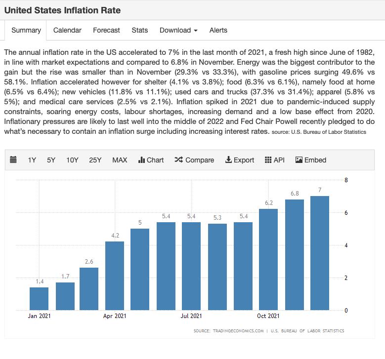 The U.S. Consumer Price Index closed 2021 at 7%. That is the highest inflation level since 1982–and remember in 1982 the U.S. had already had a solid two to three years of Federal Reserve Chairman Paul Volker’s anti-inflationary surge after the malaise of the 1970s.