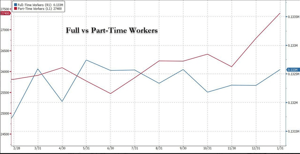 I’m not really sure, but it would appear that there are more jobs than households. That difference may occur from time to time, but it’s quite a big difference at the moment and seems to be a trend that’s confirmed by another statistic: the surge in part-time jobs as shown in this chart: