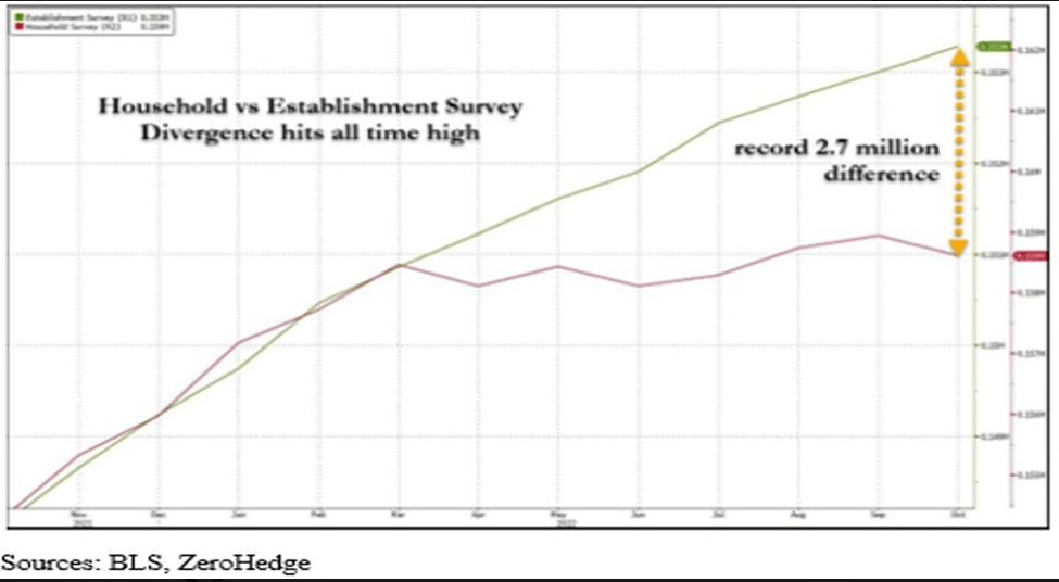 Note that the Establishment survey measures all jobs; the Household survey measures jobs per household. If you had two or three jobs, the Household survey would count you as “employed”; the Establishment survey would count the number of jobs you had. Now note that there is currently 2.7 million job difference between the two. Why?