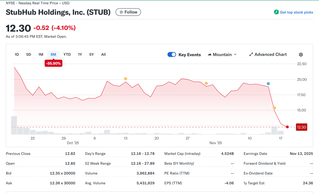 Secondary platforms reacted instantly. Reuters reports that StubHub’s U.S.-listed parent lost around 14% of its market value on the news, compounding a disastrous first earnings report. As CNBC’s Jim Cramer put it bluntly: “It’s been a bust — and when you become a busted IPO, it’s very hard to change the narrative.” The UK announcement didn’t just nudge the stock downward; it slammed the door on the rosy growth story StubHub’s bankers were trying to sell.  Readers will know just how broken up I am about that little turn of events.